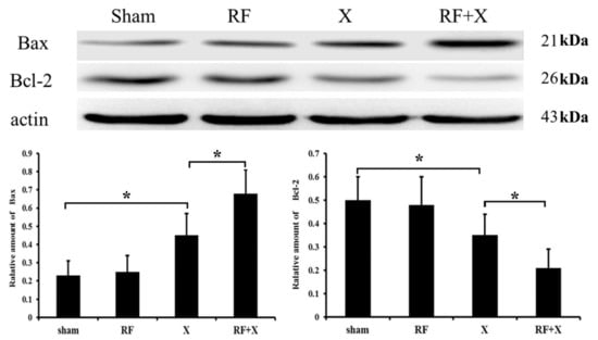 To explore the mechanisms by which exposure to RF promote X-ray-induced apoptosis, the expression level of apoptosis-related proteins was examined. As shown in Figure 6, no differences in Bcl-2 and Bax expression were demonstrable between RF group and sham group. In addition, the protein expression of Bcl-2 significantly decreased and Bax significantly increased in X-ray group. Moreover, RF exposure aggravated X-ray-induced Bcl-2 expression inhibition and Bax expression promotion.