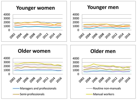 | Routine non-manuals | 9268 (45.1) | 8821 (43.6) | 8352 (42.3) | 7072 (42.0) | |