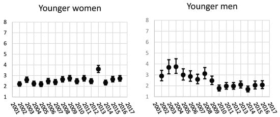 3.1. The Magnitude of Relative Occupational Class Differences in Sickness Absence Days among Younger Women and Men