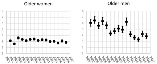 3.2. The Magnitude of Occupational Class Differences in Sickness Absence Days among Older Women and Men