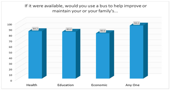 For the 1054 respondents to our survey, when asked “if bus service were available, would you or someone in your family use the bus service to improve your…” health, education, or economic situation, an overwhelming majority (>80%) replied that they would (Figure 2). The preferred destinations of respondents were: