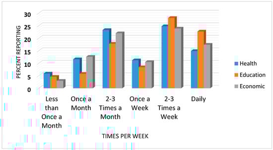 Participants were also asked how often they would use the bus service to access health, education, or economic related activities. Results are presented in Figure 3. For health, the most popular response (24.8%) was “2–3 times a week”, followed by “2–3 times a month” (23.3%). For education and economic activities, the most popular response was also “2–3 times a week” (28.1 and 23.9%, respectively).