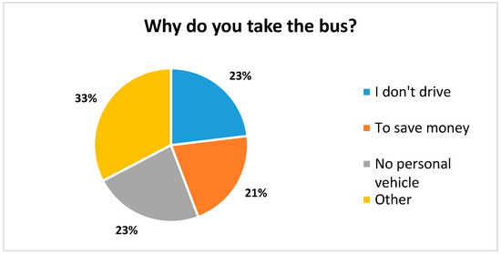 When asked “why did you take the bus?”, the majority of respondents replied either “I don’t drive”, “I don’t have a car”, or “to save money”. The remainder listed other reasons ranging from owning an unreliable car or a shared car, to socializing and being more environmentally friendly (Figure 5).