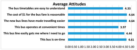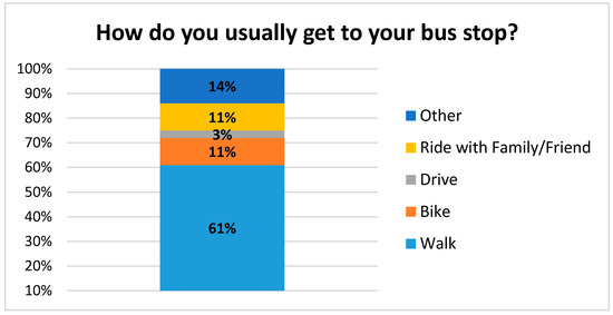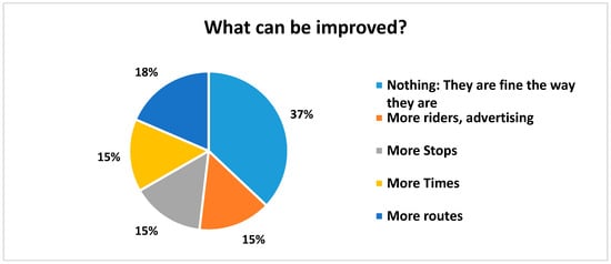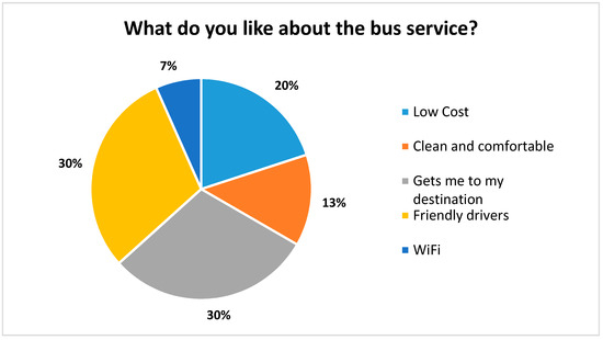 Riders were asked to rate a number of attributes of the bus system on a scale of 1–5 with 5 being the best and 1 being the poorest (Figure 6). Riders were generally very pleased with the overall timeliness, cost, ease of reading the timetables, effectiveness, and efficiency. Regarding the cost of riding the bus and customers’ willingness to pay, we asked if “the cost of $1 for the bus fare is reasonable”, which was the fare at the time. Respondents rated their answer in a Likert-type scale of agreement to disagreement; the average response was 4.64 out of a 5 point scale, with 5 being “strongly agree”. Riders did indicate that the schedules could be more convenient (rating of 3.97 on “the bus operates at convenient times”. The majority of riders walk to their bus stop (61%) and travel an average of 0.78 m in about 20 min (Figure 7). When asked, “what do you like about the bus service?”, the most common answers included the friendly drivers, the low cost, and “Gets me where I am going” (Figure 8). When asked what could be improved, the most common answer was “nothing”, but also several wanted more routes, more times, and more riders/advertising (Figure 9).