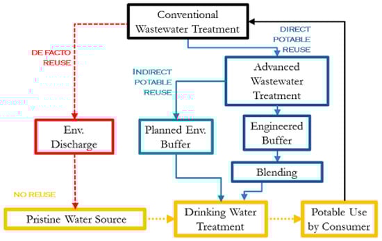 Water reuse in an urban setting can occur in many forms. Both direct and indirect potable reuse paradigms provide an alternative water source for stressed urban centers without the need for costly dual-distribution systems. Figure 1 demonstrates the various paradigms of potable reuse. De facto reuse occurs when the drinking water supply intake for a community is located downstream of a wastewater treatment plant (WWTP) discharge of another community [3]. This form of reuse is unintentional, is often not officially recognized, and is ubiquitous in many parts of the US [3]. In dry summer months, some rivers can become primarily wastewater effluent discharged from upstream facilities [4]. Planned reuse can be for either potable uses, such augmenting the community drinking water supply, or for non-potable uses, such as landscape irrigation [5].