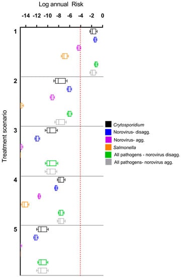This comparatively small reduction in earlier treatment trains is especially apparent for the norovirus-disaggregated estimates (for example, Figure 3 train 2). This is due to the fact that the Fractional Poisson disaggregated dose response model will predict higher risks at low doses compared to other available norovirus dose response models; risk curves for scenarios modeled by van Abel et al. [60] using the disaggregated model show a flatter curve when the dose is below 100 gene copies compared to scenarios modeled using the aggregated model (see original reference Figure 1). It is worth noting that several studies have documented virus aggregation in natural waters [41,44,66].