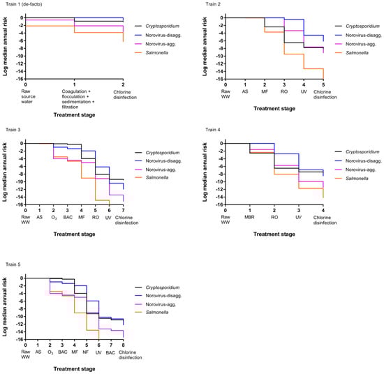 A comparison of annual risks of each treatment train as they progress through the treatments processes is shown in Figure 3. Train 1 (de-facto reuse) has lower starting risks for Salmonella and norovirus-aggregated compared to the other treatment trains because the starting matrix is secondary treated wastewater effluent-impacted surface water rather than raw wastewater, and the concentrations of pathogens are therefore lower. Additionally, no reduction in median annual infection risk for the activated sludge process is visible for Train 2 through 5 and minimal reductions are observed for norovirus-disaggregated in some other early treatment stages. In the early treatment stages, concentrations of pathogens can still be high after a given treatment process, and the risk may still therefore be close to 1 even if there has been a pathogen reduction, resulting in only small or nonexistent differences in Figure 3.