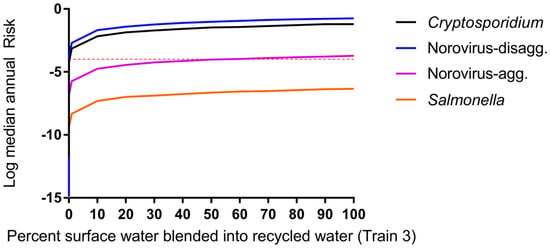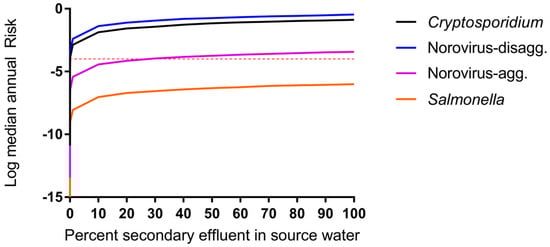 Impact of surface water quality on DPR risk modeled as percent of source (surface) water comprised of secondary treated wastewater effluent (Treatment train scenario (1), de facto reuse, case b, Fblend = 1, 0 < Fdilution < 1). Median annual risks shown for each pathogen. Microbial risk is driven by surface water quality even when supplies are impacted by 1% secondary treated wastewater effluent.