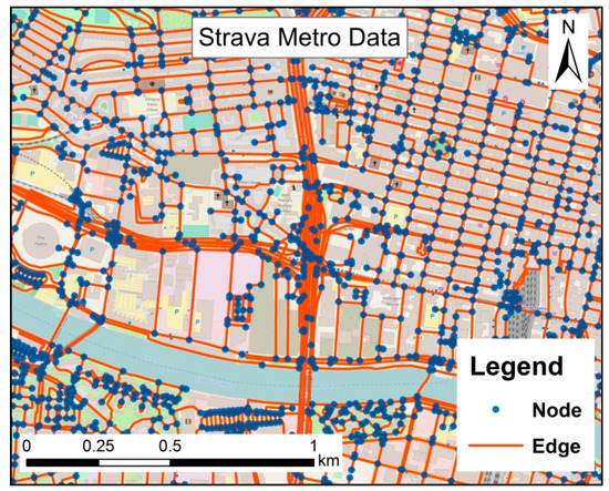 Edges and nodes of Strava Metro data (Basemap: OpenStreetMap, licensed under the Open Database License).