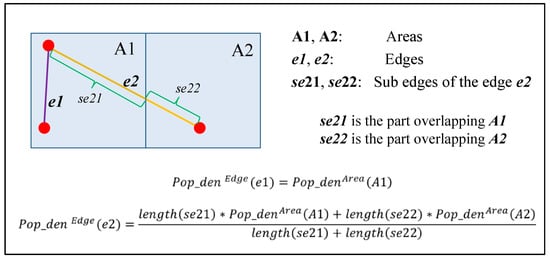 Population density and employment density equal the population density and employment density of the Output Area (OA) where the street is located if the street is located completely in this OA; otherwise, population density and employment density are a weighted mean of population density and employment density of the OAs that overlap the street. Figure 2 shows a simple instance where a street overlaps two different areas (OAs). Suppose e is a street and (i = 1, …, k) represents the overlapping part of e and a OA. k also represents the number of OAs overlapping e. The weighted population density and employment density for e are calculated as:
