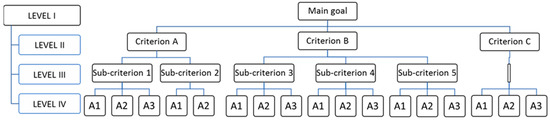 - intermediary levels, which represent criteria and subcriteria for evaluating the alternatives (named A1, A2, A3), as represented in Figure 1.