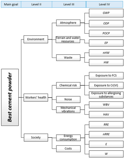 The study focused on the choice of the most sustainable cement powder to be used for cement bound mixtures (e.g., grouts, mortars, concrete). The four cement powders are identified by the nomenclature cement n, with n varying from 1 to 4, and they are produced by different plants numbered according to the cement nomenclature (i.e., cement 1 is produced by plant 1 or company 1). The hierarchy defined by the authors involves four level of analysis, as represented in Figure 2: