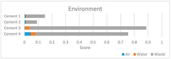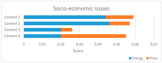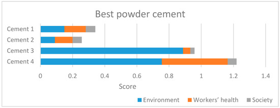 Cement 4 is the most sustainable, and its performance is affected by the workers’ health criterion. Indeed, this contribution is 0.409, more than 33.4% of the overall result, and considerably more than the workers’ health contribution for the other cements (Figure 4). The results highlight the importance of considering more criteria in the analysis: