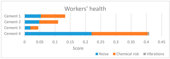 The chemical risk assumes an important role, as expected, since the operators come into contact with substances which significantly affect their health. The purchase of new equipment and the use of additives and chemicals not harmful to human health rewarded company 4. It is therefore confirmed the need for adopting protective and preventive measures to reduce chemical risks, especially for plant 3, which has the worst workers’ health performances. According to Figure 4, the noise in cement plants represents the second factor of risk after the chemical one: mechanical equipment produces high noise, especially if they are not compliant with noise regulations [44]. It is therefore important to quieter equipment and machinery, and use hearing protection to reduce this risk [45,46]. Figure 5 represents the results obtained about the socio-economic issues.