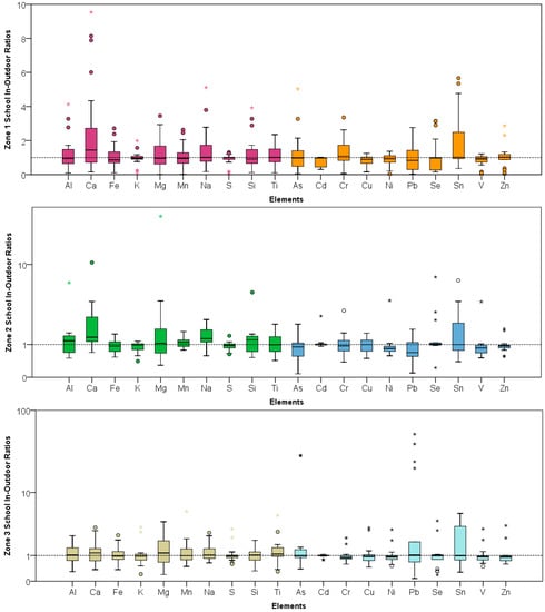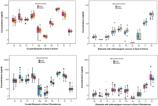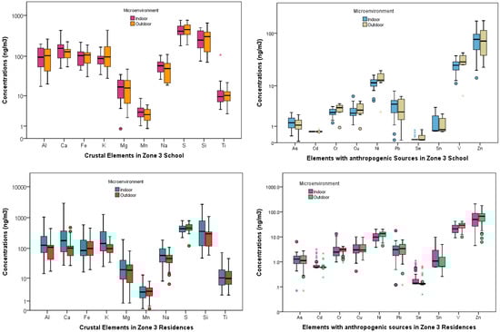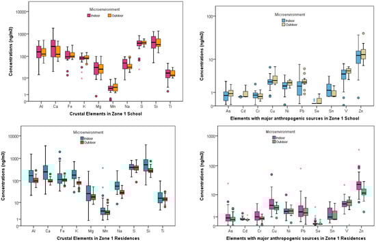 Table 2 and Table 3 show the basic statistics for the element concentrations at the schools and residences (both indoors and outdoors) for the three zones, respectively. Al, Ca, Fe, K, Mg, Mn, Na, S, Si, T are typically considered to be of natural origin such as earth crustal, volcanic or soil tracers. As, Cd, Cr, Cu, Ni, Pb, Se, Sn, V, Zn are elements that are usually attributed to anthropogenic sources []. These elements are primarily emitted from vehicles (tailpipe, brake and tire wear, engine abrasion), industrial facilities (heavy metal industries, smelting operations, fuel and coal combustions), and uncontrolled waste incineration and biomass burning. Spatial contrast between these two subgroup of elements for the schools and residences in both the indoor and outdoor microenvironment at the three zones are shown in the boxplots (Figure 2, Figure 3 and Figure 4).