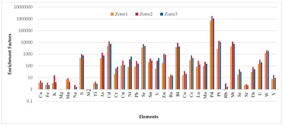 where ci is the mass concentration of element i and cAl is the concentration of the reference element aluminum. The subscripts ‘air’ and ‘crust’ indicate that the ratios were obtained from the concentrations of element i and reference element Al in the air and upper continental crust, respectively. EF < 10 suggests the enrichment of elements by natural geological sources. EF between 10 and 100 indicates enrichment by anthropogenic sources in addition to crustal sources and EF > 100 indicates anthropogenic sources are the major enrichment contributors for these elements []. One notices that the thresholds used by these authors are optimal and other thresholds, especially for moderate enrichments (both anthropogenic and crustal), have been used by other researchers []. The EF values were displaced in a logarithmic scale for the elements at the three zones as shown in Figure 6.