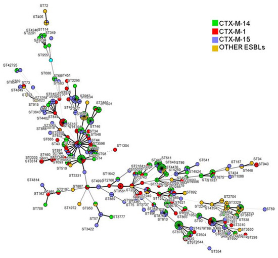 Minimal spanning tree constructed based on the MLST profiles of the 448 ESBL-producing E. coli isolates and coloured according to ESBL genes (Bionumerics v7.5, Sint-Martens-Latem, Belgium).