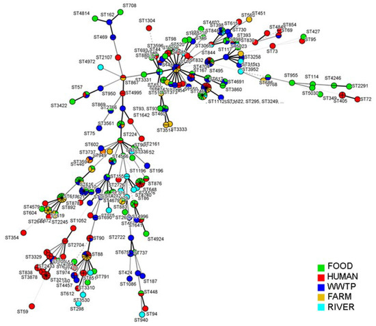 Minimal spanning tree constructed based on the MLST profiles of the 448 ESBL-producing E. coli isolates and coloured according samples’ origin (Bionumerics v7.5, Sint-Martens-Latem, Belgium).