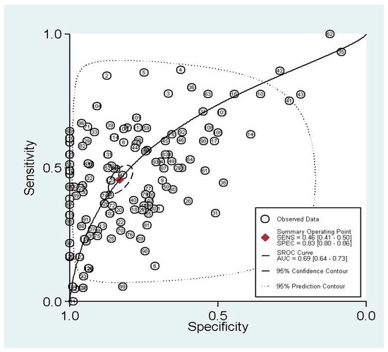 The graph of the SROC (summary receiver operating characteristic) cure is shown in Figure 2, which demonstrates the trade-off between SEN and SPE values in multiple studies. The SROC curve results showed that AUC (area under the curve) of 32 different methylated genes was 0.69 (0.64–0.73), indicating the ability of 32 pooled gene methylations to differentiate lung cancer patients from non-lung-cancer patients with a mid-level accuracy.