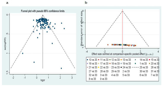 Funnel plot of the publication bias (a) from Deeks’ test, the data is based on the article of cases and controls. (b) From Egger’s test, the data is based on the article indirect comparisons of methylated gene for 1–32 (1/CDH1, 2/SOX17, 3/CDO1, 4/ZFP42, 5/TAC1, 6/H-cadherin, 7/FHIT, 8/PCDH20, 9/Dab2, 10/Dcr2, 11/SULF2, 12/Kifla, 13/Dal-1, 14/Jph3, 15/RASSF2, 16/TCF2l, 17/CXCL, 18/MAGE, 19/HOXA, 20/RARβ, 21/FAM19A4, 22/PHACTR3, 23/DAPK, 24/3OST2, 25/PRDM14, 26/GATA, 27/MGMT, 28/PAX5, 29/CYGB, 30/APC, 31/p16, 32/RASSF1A) and 33/the gold standard of being diagnosed with lung cancer.