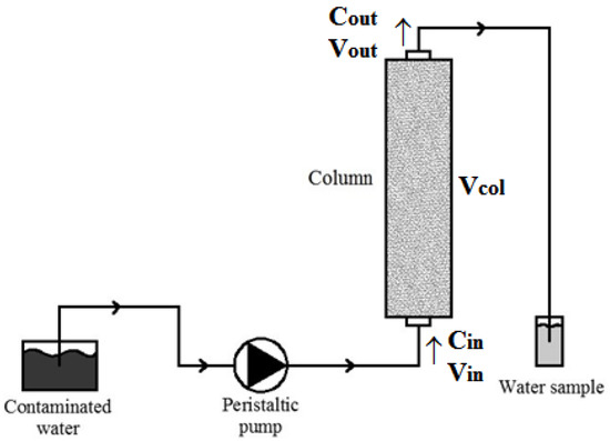 Batch tests require little time, but the column tests, conducted continuously, are able to determine the process parameters under dynamic flow conditions and therefore in conditions closer to real ones, expected in a PRB system built in the field [27,76]. Thus, column tests provide the best indications of the optimal ratios for cost-effectively removing contaminants while maintaining satisfactory hydraulic conductivity. Therefore, column tests were performed to verify the removal efficiency of the pollutants considered by the cabuya fibers during the hydraulic drainage within the column. For each fiber sample on which the test was performed it was verified that the structure, texture, location and degree of compaction were compatible with the water flow in the aquifer. Moreover, it was verified for each test that the velocity value was such as to ensure an adequate contact time between the contaminated solution and the medium reagent, namely the fibers, to ensure a complete process of detention and degradation of the contaminant. The tests were conducted and repeated with 15, 30 and 60 cm long Plexiglas columns with an internal diameter of 4.4 cm, filled with the fiber samples with a density of 160 kg/m3. The column tests were carried out using only copper, zinc and cadmium as pollutants, as, for reasons of laboratory management, it was not possible to perform the column tests for lead. The flow of the solution through the column, with the assigned concentrations of pollutants reported in Table 1, was provided continuously by a peristaltic pump set at 5 r/min (≈10 m/day) in a way that still has a speed plausibly close to the normal rate of filtration in the groundwater. The flow was set from the bottom to the top of the column by allowing the escape of any air bubbles. At the top of the column, where there is the water output, samples were taken periodically and subjected to concentration measurement. The column test apparatus is sketched in Figure 3.