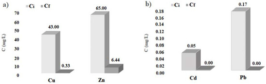 Initial (Ci) and final (Cf) concentrations of the batch tests carried out with cabuya fibers. (a): for Cu and Zn; (b): for Cd and Pb.