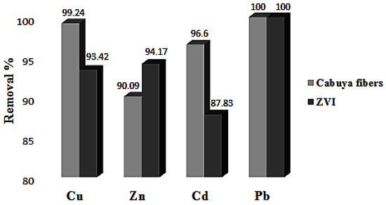 Furthermore, in Figure 6 the histograms of removal percentage of heavy metals considered, for cabuya and ZVI, are reported.