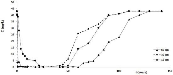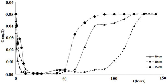 The duration of each test was 150 h, in order to investigate not only on the process of removing the pollutant, but also the next step of release. For the duration of each test, at fixed times, appropriate sample outputs from the columns were collected, then subjected to analysis to determine the minimum value of the concentration, the corresponding value of the maximum removal percentage, the filtration times corresponding to these maximum values and the duration of the pollutant release step. Figure 7 shows the variations of the copper concentration over time, for each test performed with the columns of different length. Analogous changes in concentrations of zinc and cadmium are shown in the graphs of Figure 8 and Figure 9. Table 3 and Figure 7, Figure 8 and Figure 9 confirm that the cabuya fibers have a high removal capacity of the heavy metals investigated. This is certainly true for copper, although also for zinc and cadmium the removal recorded in the column tests was almost total. The maximum value of the removal percentage was obtained for copper after 26 h, for all three columns of different lengths. For zinc these times vary from 2 to 26 h, according to the length of the column, while for cadmium these vary from 10 to 22 h in a manner increasing with the length of the column.