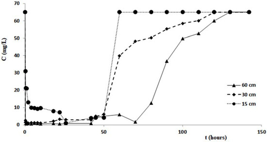Variation of cadmium concentration vs. time for the tests with column length equal to 15 cm, 30 cm and 60 cm.