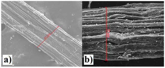Electron microscope analysis showed that bundles of cabuya fibers tend to assume larger diameters than those of Spanish broom, as evidenced by a comparison of SEM images Figure 11a diameter equal to 274 μm and Figure 11b diameter equal to 50 μm.