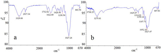 To investigate better the mechanisms that contributed to determine the behaviors highlighted and the results obtained, the FTIR (Fourier transform infrared spectroscopy) technique was used for both cabuya and broom fibers. Figure 12a,b show the infrared spectrum of cabuya and broom fibers, respectively. The graphs a and b of Figure 12 have the wave number in abscissa, expressed in cm−1, while in ordinates have the transmittance (T), namely the ratio of the intensity of the transmitted light to the intensity of the incident light, expressed in percent [81].