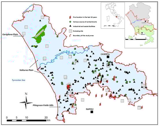 The Litorale Domizio-Agro Aversano area of the Campania region in southern Italy was recognized as a National Interest Priority Site (NIPS) in 1998, owing to the large number of potentially polluted sites, caused by widespread illegal dumping of industrial and municipal waste []. Italian law (L. 426/98 and D. Lgs. 152/06) requires that reclamation activities must be carried out in NIPSs. In 2013, the priority level of the area for reclamation of contaminated areas was downgraded from national to regional by the Italian authorities. This downgrade did not correspond to a decrease of contamination status, but rather to a transfer of competence for the reclamation work, now ascribed to the Campania Region.