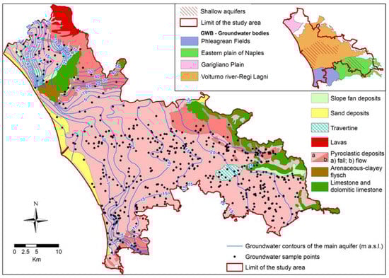Hydrochemical data used for the present study (almost 350 sampling points) mainly refer to the main aquifer. In the southern part of the plain of the Volturno river—Regi Lagni GWB there is a larger dataset, related to arsenic and other organic and inorganic contaminants. In 2014, the dataset was integrated with about 50 new chemical analyses of groundwater sampled exclusively in the sectors more affected by contamination problems.