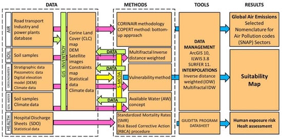 Flow chart of the integrated environmental-health characterization of the study area, via GIS inventory and Spatial MultiCriteria Decision Analysis (S-MCDA). Suitability map refers to areas suitable for bioremediation reclamation techniques.