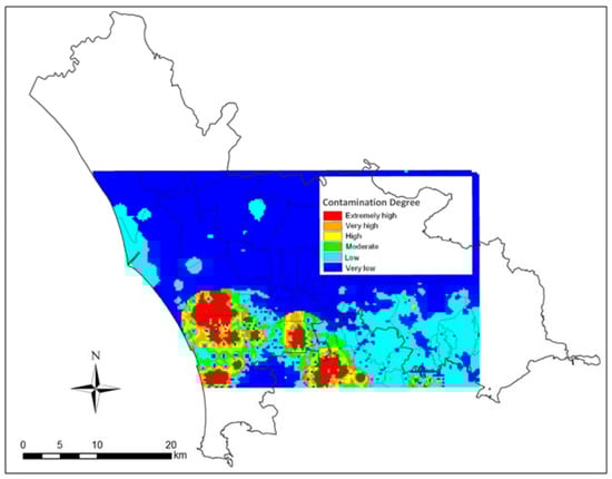 The CD map (Figure 5) is based on the distribution of As, Be, Cd, Cr, Co, Cu, Hg, Ni, Pb, Sb, Se, Sn, Tl, V, Zn. Figure 5 represents a part of the study area and itshows that the areas in red colours are the most polluted of the entire study area.