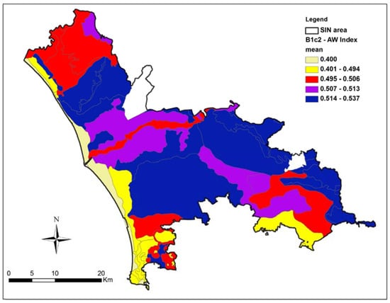 It has to be stressed that site specific studies are needed case by case, to establish clearly the natural or anthropogenic sources of the above reported metals/metaloids. Regarding soil hydraulic parameters, a map of AWindex is reported in Figure 6 and it shows greater or lesser allocation of AW in dimensionless terms.