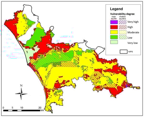 The map of susceptibility of the main aquifers to contamination (Figure 7) shows the prevalence of moderate vulnerability, with areas of low permeability near the Volturno River, where clay and peat are widespread. In the coastal areas, vulnerability is substantial for small depths to water and for the grain size of the vadose zone. Strong vulnerability is also evident at the foot of carbonate mountains and where the aquifer is semi-confined. The map of susceptibility of the shallow aquifers to contamination shows greater vulnerability because of the small depth to water.