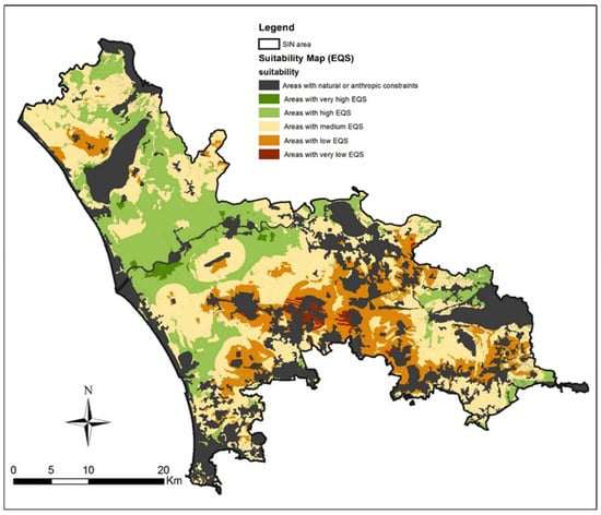 From the S-MCDA is sorted out the suitability map along with the identifications of areas more susceptible to land use change. The suitability map was classified in 6 classes with Natural Jenks classification []. From the S-MCDA is sorted out the suitability map consistent with the bio-remediation techniques. The identifications of the areas more susceptible to land use change is a consequence of suitability map, with a raster ranking. The suitability map was classified in 6 classes. Firstly, areas with natural or anthropic constraints were highlighted. The other classes were sorted out from a Natural Jenks classification [], which group data into like classes, minimizing differences within each data class and maximizing differences between classes. The classification has to be considered as a baseline from which to build scenario analysis [].