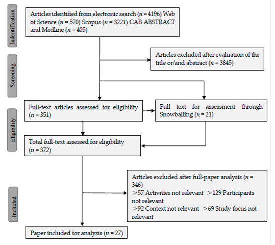 We got a total of 4196 hits (Web of Science 570; Scopus 3221; CAB ABSTRACTS and Medline 405). Due to the reasons stated above and because we aimed at high sensitivity we could not adhere solely to our predefined search protocol, but were forced to use extended sources to obtain as much information as possible. This resulted in rather low precision in our first yield, as is reflected by the number of the hits and selected literatures after the first round of selection where 351 literatures were selected for the second round of selection. For all the studies described in this review, as a minimum, the abstracts were read. In addition to the papers from snowballing, the full texts of the articles whose abstracts qualified were read for selection based on the outlined criteria. This process resulted in the final selection of 27 articles (Figure 1).