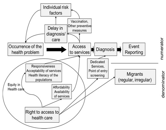 Three aspects are particularly relevant when addressing the issue of monitoring infectious diseases. Firstly, almost all our monitoring systems, particularly those focusing on infectious diseases, are based on the notification of identified cases of disease and other health related events (i.e., vaccination, infection status) that are diagnosed or occur only when a person has contact with the health services. Therefore, access to health services strongly influences any attempt to monitor the health status of a specific population. For a migrant, the probability of accessing health services is obviously influenced by the country legislation and the right for migrants to access health care, which could be different according to their legal status (i.e., regular, irregular, asylum seeker and all the other different conditions that the administrative system can distinguish). However, health system accessibility is also influenced by factors not directly linked to the laws regulating the right to access. These include: the affordability of the system (i.e., if it is free or not, if insurance is needed) and the responsiveness of health services (i.e., if mediators or language interpreters are available, accessibility of the clinics etc.) (Figure 1, bottom left part) [11].