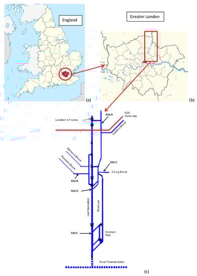The European Union (EU) Water Framework Directive [] established a framework for water protection and management with the objective that surface and ground waters in all member states should achieve good ecological and chemical status by 2015 followed by two six-year cycles to allow further development of river basin management plans. A total of 45 substances, including five metals, have been identified as being of particular concern with 24 of them (including Ni and Pb) classified as priority substances (PS) and 21 designated as priority hazardous substances (PHS; including Cd, Hg and Sn (as tributyltin)) []. Pollutants classified as PS were required to meet Environmental Quality Standards (EQS) by 2015 with a PHS designation signifying that emissions of these substances to water need to cease. However, in 2015 within the Thames river basin district, which incorporates the River Lee catchment, it was reported that 45% and 17% of water bodies continued to be affected by point pollution discharges of wastewater and urban diffuse pollution, respectively [].