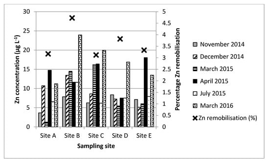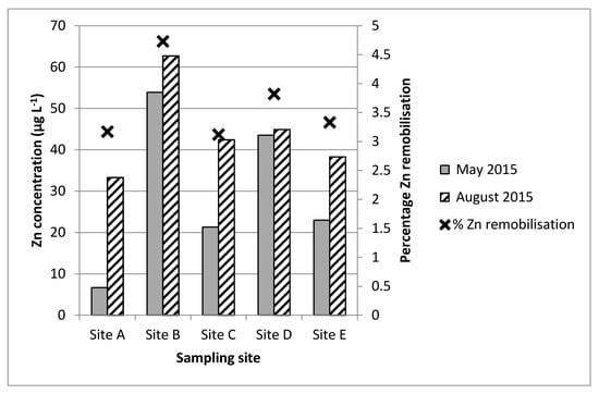 Overview of mean Zn aqueous concentrations during dry weather events at sites A–E in relation to Zn sediment remobilisation (%) determined during laboratory batch tests.