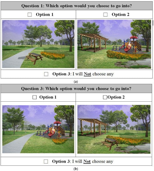 Towards this goal, we need to know, first, which landscape features should be included to effectively encourage the visits of different user groups. Secondly, which landscape features should be prioritized based on their relative importance to different user groups must also be determined. To answer these questions, we will use the framework of discrete choice modeling (DCM) [,,] to elicit choices among design alternatives (details in Section 2.3) and develop experimental choice sets to investigate how landscape features link to users’ visitation.