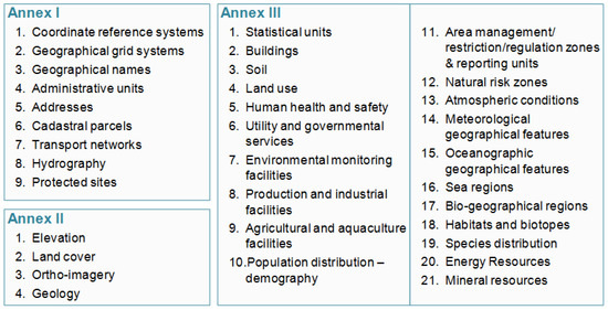 The INSPIRE Directive [12], within the broader context of SEIS, aims to provide harmonised, high quality spatial information available to support environmental policies along with policies or activities which may have an implicit impact on the environment in Europe. This legally mandated initiative paves the ground for European countries to build a common Spatial Data Infrastructure (SDI). INSPIRE is organised through 34 data themes (see Figure 1) and a set of standardised web-based services aiming to significantly improve the access and usage of data. Developed through a transparent and participatory process, INSPIRE will enable the sharing of environmental spatial information among public sector organisations and better facilitate public access to spatial information across Europe. The implementation process of the Directive should be completed by the end of 2021 and adopts a step-wise approach where the overall process is improved by feeding the discoveries of implementers into existing technical guidance documentation. Legislatively INSPIRE is divided into the following components: metadata, network services, interoperability of spatial data sets and services, data sharing, monitoring and reporting. It is worth noting that INSPIRE uses international standards as building blocks of the European interoperability infrastructure, thus by implementing it national authorities add value to their existing systems through harmonising them. Significant share of the standards which are being used in INSPIRE are created within the Open Geospatial Consortium (OGC) and the International Standardization Organization (ISO).