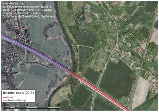 Mismatch of road network geometry reported to the EEA by Germany and Poland in 2013.