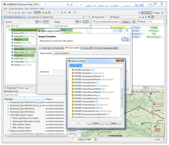 To prove the added value of INSPIRE, particularly for harmonising data across borders for the purposes of comparable assessment of environmental noise, we transformed the data for both Saxony and Poland through the use of an open source extract-transform-load (ETL) tool called HUMBOLDT Alignment Editor (HALE). The product is described by Reitz and Templar [30] and provides functionality for mapping between source and target application schemas. Following the mapping it is possible to transform data in accordance with the INSPIRE models, as defined in Section 1.3 of this paper. Within HALE we imported both data sources, and mapped them (Figure 6) according to the INSPIRE common data specifications. The output data files can afterwards be combined and used together. Extending to a European level would result in harmonised noise data, which would be a solid basis for a better understanding of the problem, as well as for informed decision making and improved policy making.