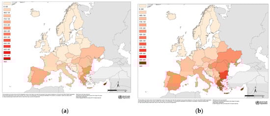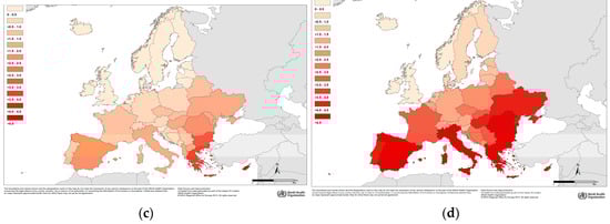 Current high summer ambient temperatures have an important impact on the European population health and increase of heat-related mortality and morbidity are identified as being a potentially significant consequence of climate change in Europe [,]. This impact is expected to increase in the future, according to the projected increase of mean ambient temperatures []. Several studies estimated the future heat-related mortality in European Union countries arriving at largely comparable results: Projection of Economic impacts of climate change in Sectors of the European Union based on bottom-up Analysis (PESETA), ClimateCost and PESETA II [,,,].