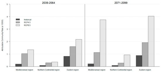 Attributable Community Rate (ACR) per 10,000 inhabitants expected for the future time laps 2036–2064 and 2071–2099 under the historical scenario, RCP 4.5 and RCP 8.5 by macro-region (RCP: Representative Concentration Pathways).