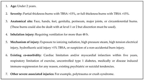 - Australian and New Zealand Burn Association. ANZBA Referral Criteria. Available online: http://anzba.org.au/care/referral-criteria/ (accessed on 7 July 2016).