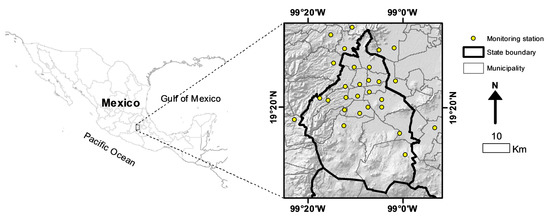 The Mexico City metropolitan area is one of the world’s largest urban agglomerations, with approximately million inhabitants spread over at an average elevation of 2240 m above mean sea level. It is surrounded by mountains to the east and west, creating a basin with low points to the the north which leads to air pollution problems because of limited ventilation [6]. Two synoptic wind regimes prevail throughout the year: an anticyclonic westerly wind from November to April and a moist trade wind associated with the rainy season from May to October. Despite weak prevailing synoptic winds, the thermally induced local wind converges toward the city, which tends to restrict the ventilation of polluted air [32]. The study area and the locations of the primary sampling sites are shown in Figure 1.